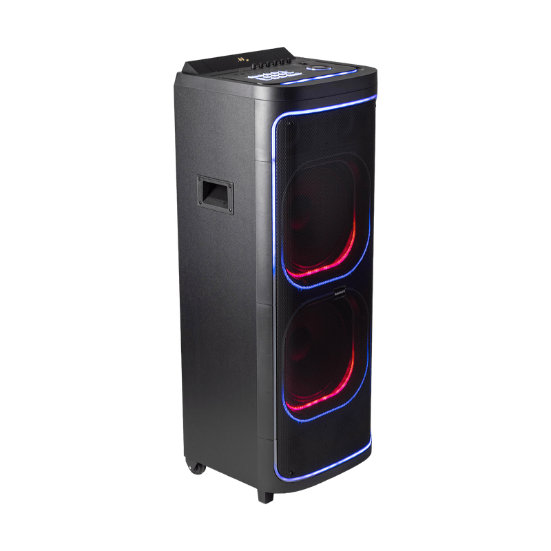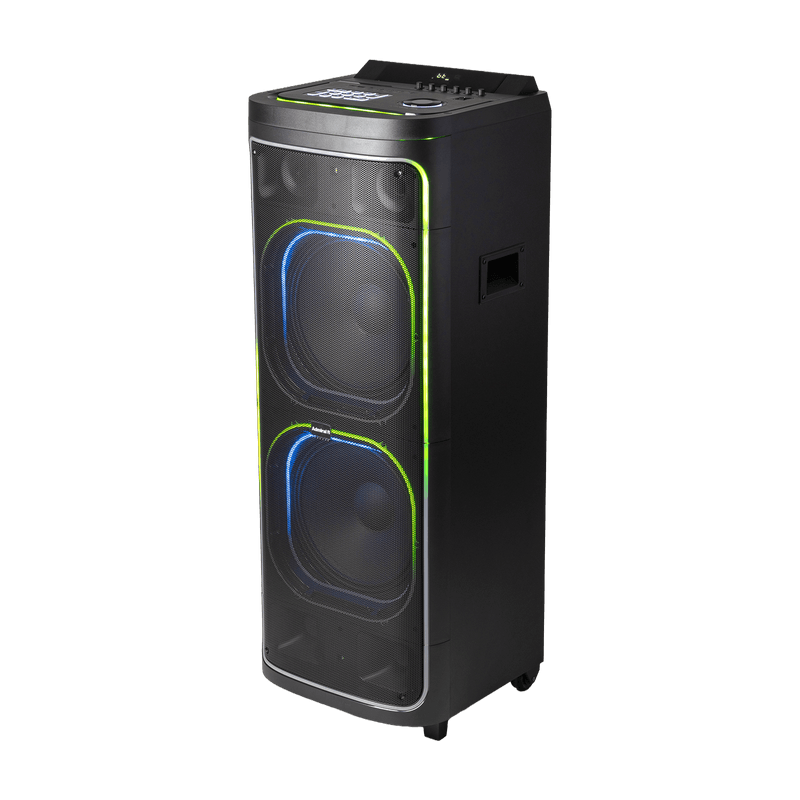 Con doble woofer de 12 pulgadas y una potencia real de 100W RMS, este sistema de audio de alta potencia está diseñado para fiestas grandes y eventos que exigen graves profundos y un audio nítido y profesional.