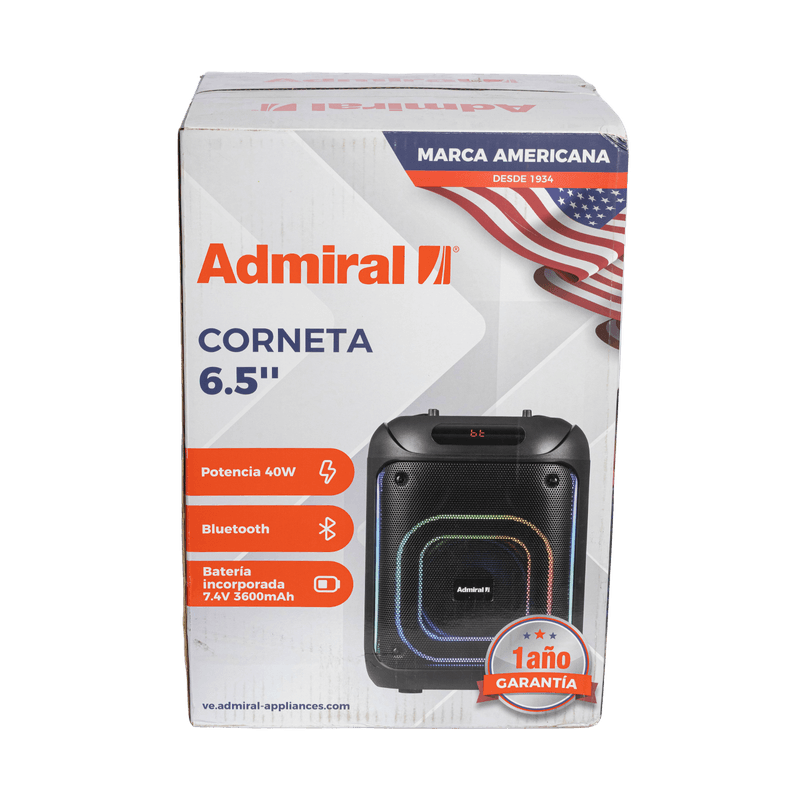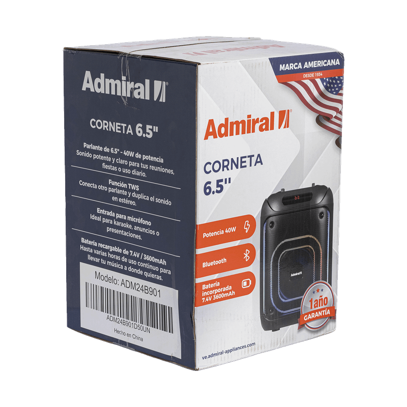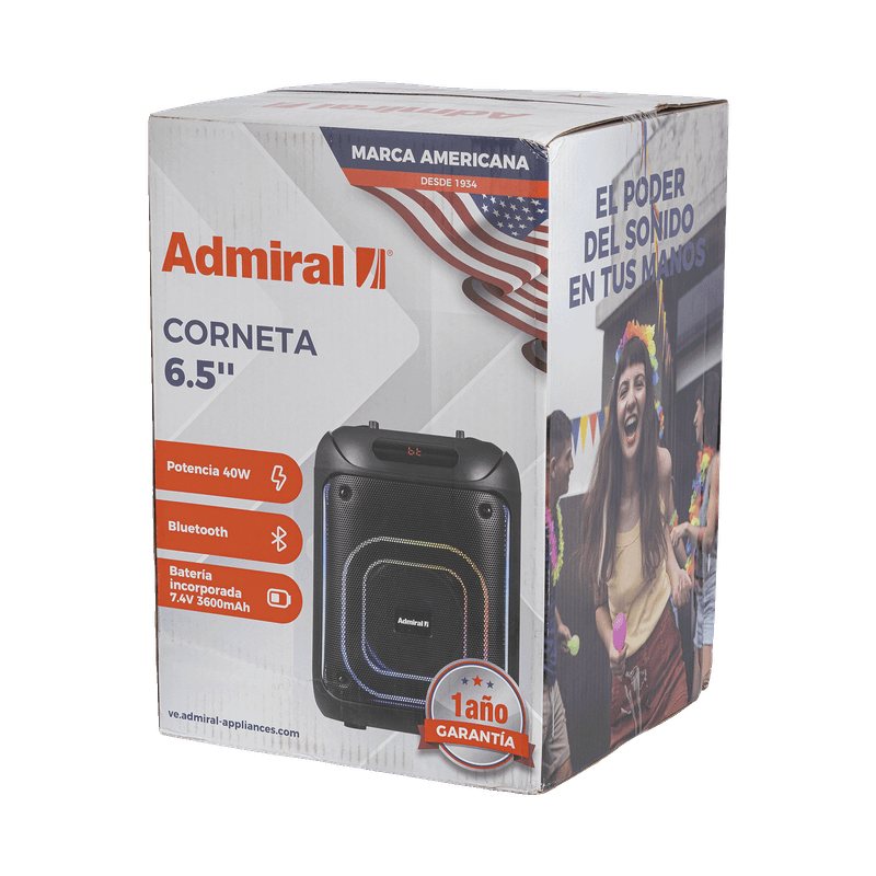 Corneta Bluetooth 6.5" Admiral, un parlante diseñado para ofrecer una experiencia de audio clara y potente en distintos entornos. Gracias a su potencia de 40W y su parlante de 6.5 pulgadas, proporciona un sonido equilibrado, ideal para música, presentaciones y reuniones sociales. Su conectividad Bluetooth permite enlazar dispositivos móviles de forma sencilla, mientras que la batería incorporada de 7.4V 3600 mAh brinda autonomía para disfrutar del audio sin depender de conexiones constantes. Es una opción práctica para quienes valoran movilidad, funcionalidad y buen rendimiento sonoro.