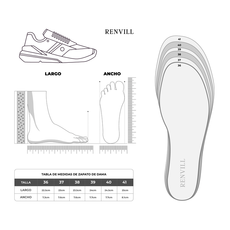 Disponibles en tallas que van desde el 36 hasta el 41, estos zapatos han sido diseñados para adaptarse a una variedad de formas de pie, asegurando un ajuste perfecto que brinda soporte durante todas tus actividades.
