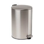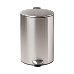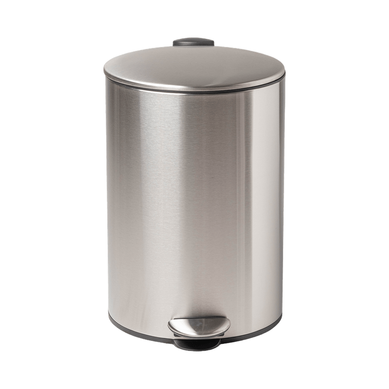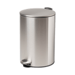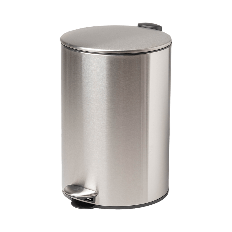 Papelera cilíndrica de 20 litros en acero inoxidable, con cierre suave y silencioso. Diseño moderno, resistente y de fácil limpieza.