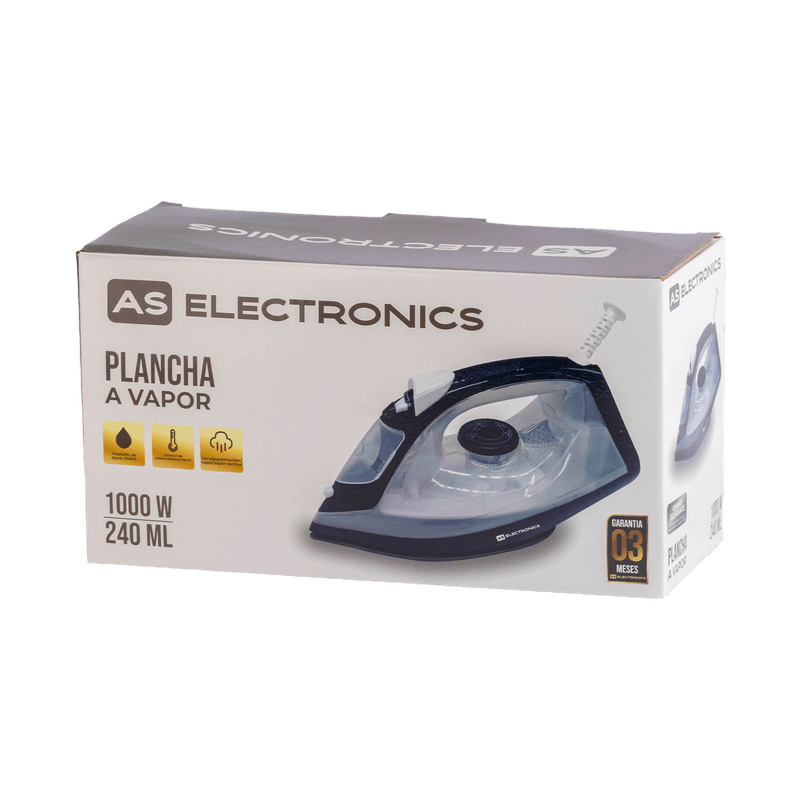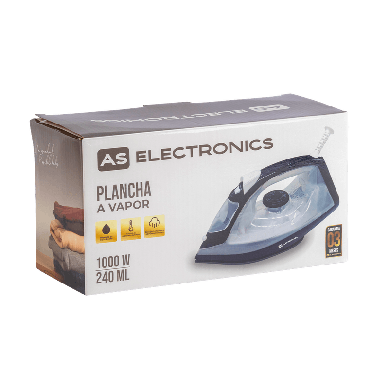 La plancha a vapor AS Electronic 7R05 combina una robusta potencia de 1000W con un conjunto completo de características para hacer del planchado una tarea sencilla y eficaz.