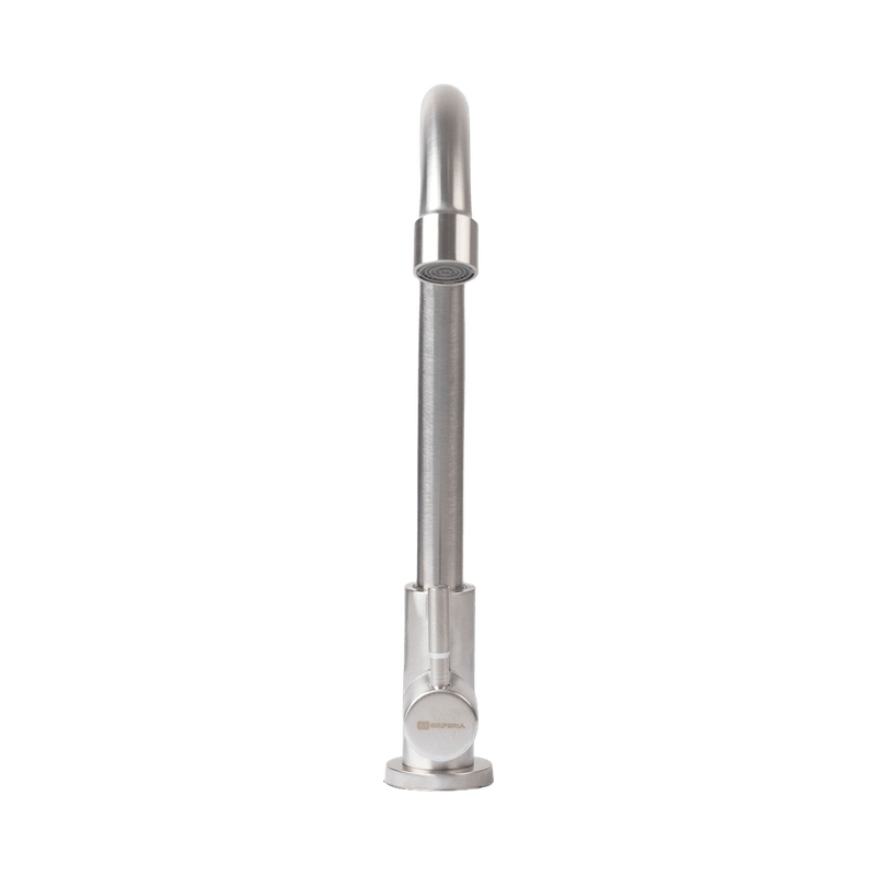 El modelo E20 no solo funciona bien, sino que se ve espectacular. Su forma curva elegante y su acabado plateado satinado aportan un toque de modernidad sutil y atemporal a cualquier fregadero. Este acabado no solo tiene un aspecto premium, sino que está diseñado para minimizar las huellas dactilares y las manchas de agua, manteniendo su brillo impecable con solo una limpieza rápida.