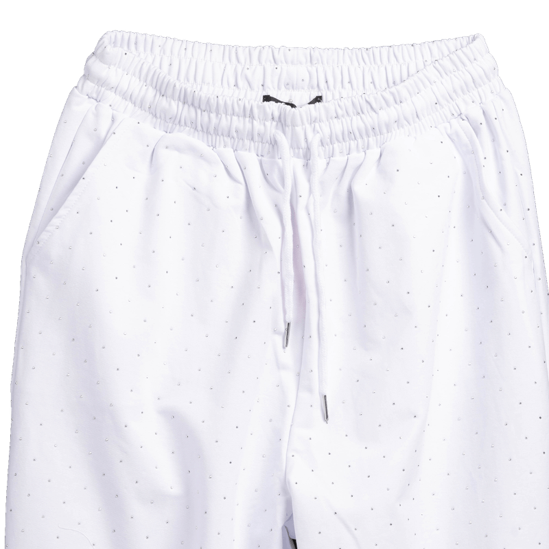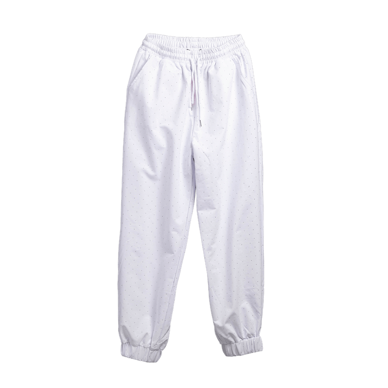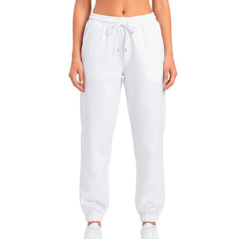 Este no es un jogger común. Su diseño unicolor en una base versátil se convierte en el lienzo perfecto para un detalle que lo eleva: la pedrería brillante sutilmente dispersa. Este toque luminoso añade una dosis inesperada de glamour a la silueta casual, asegurando que te sientas elegante sin sacrificar la relajación. El corte jogger se define con el elástico en los tobillos, creando una forma moderna y favorecedora.